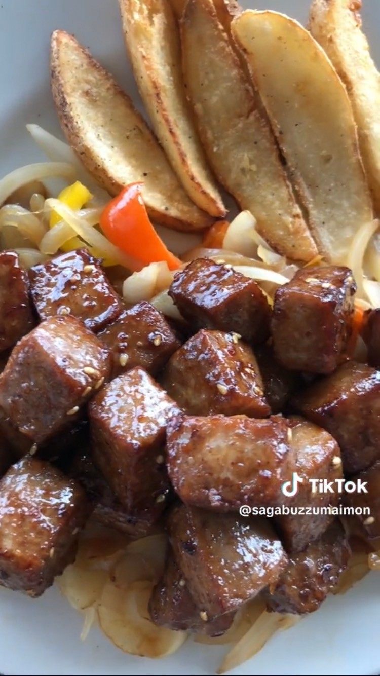 特製のタレを使ってサイコロステーキに仕上げています。